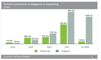 Total fintech funding hit $983.6m in 2017 versus Hong Kong's $596.8m.